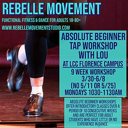 Always wanted to learn to tap, but you're not sure where to start? Absolute Beginner Adult Tap with Lou Moulder from Rebelle Movement is a great class for the tap novice. Classes will focus on establishing basic tap fundamentals, vocabulary, and basic rhythms to create more advanced combinations of sound. No previous tap experience is necessary. Some modifications can be made to support students that require a more low-impact workout. This class is made for adults (18-80+). ****THIS CLASS IS HELD AT: Lane Community College - FLORENCE CAMPUS - Ditzhazy Dance & Wellness Studio ****REGISTRATION is through Rebelle Movement directly and not LCC 10:30-11:30am, Monday March 30 - June 8 (no class 5/11 or 5/25) Tuition $135 for 9 week series or $17 for Drop-In